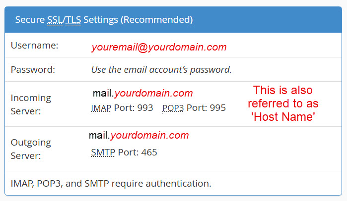 Below are basic settings, you would put your specific email and password as well as the Host Name or Incoming/Outgoing server would be ‘yourdomain.com‘.